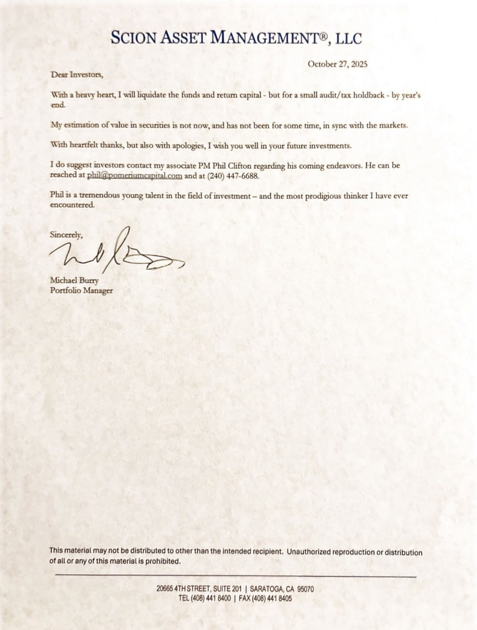 마이클 버리는 다음과 같은 내용을 투자자들에게 전했습니다.