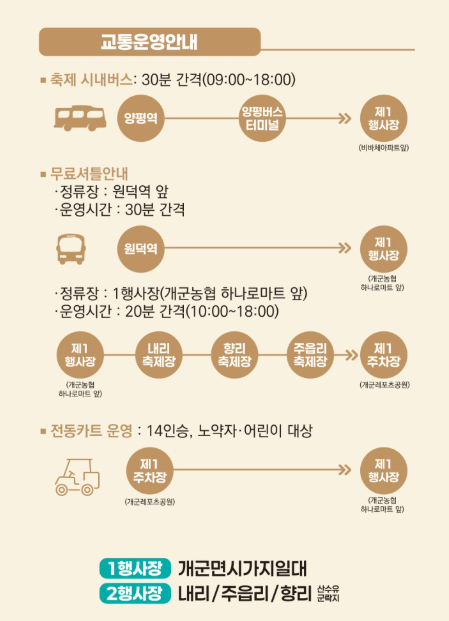 - 코스 2: 제1행사장(개군농협 하나로마트 앞) ↔ 내리, 항리, 주읍리, 제1주차장 (20분 간격)