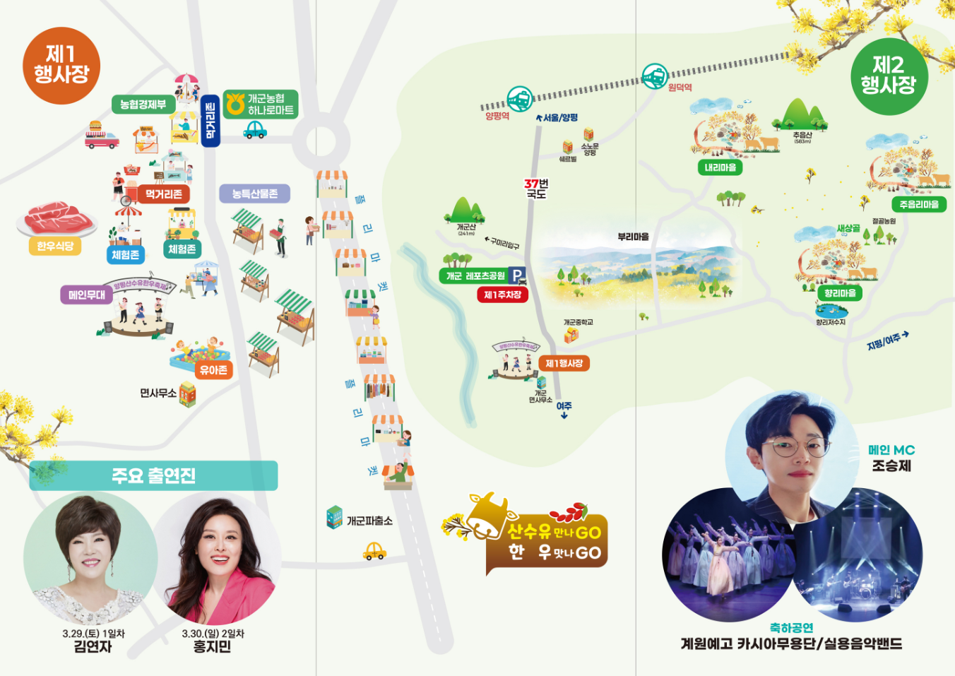이번 축제는 개군면 시가지 일대(1 행사장)와 내리·주읍리·항리(2 행사장)에서 진행되며, 봄을 맞아 활짝 핀 산수유 꽃길과 맛있는 한우 요리를 함께 즐길 수 있는 특별한 행사입니다.