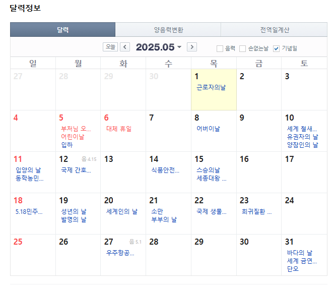 ✔ 5월 1일(수) – 근로자의 날 (공무원 및 일부 직업군 제외하고 유급 휴일 적용)
