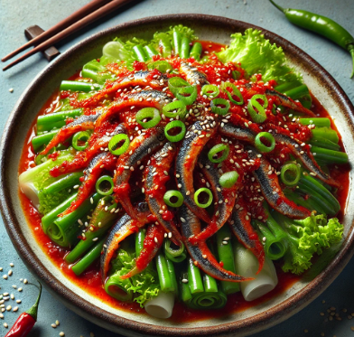 멸치를 싱싱한 상태에서 새콤달콤한 양념에 버무려 감칠맛이 뛰어난 회무침.
